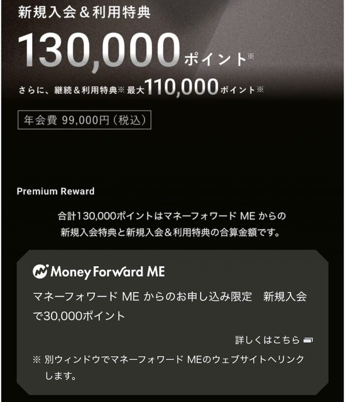 参考 :Visa Infiniteを発行するなら、マネーフォワードME経由がオススメ